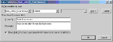 Grâce au panneau d'information personnalisé, si l'utilisateur met la colonne Nom Fournisseur à blanc, il recevra ce message