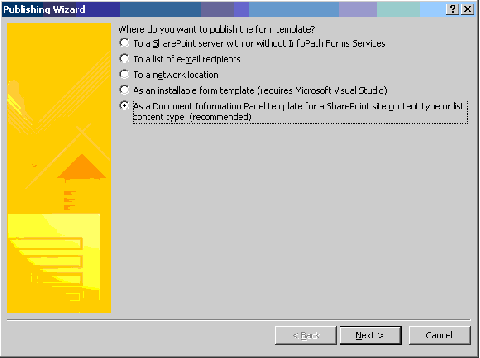 Lorsque vous avez terminé les modifications, cliquez sur le bouton Publish Form Template se trouvant dans la barre des tâches d'Infopath à droite de l'écran. Infopath vous demande d'enregistrer votre document, faites-le et spécifiez un emplacement sur votre disque dur. Ensuite, Infopath vous propose de publier votre template vers votre type de contenu