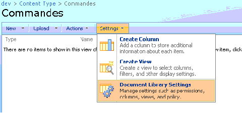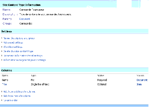 A partir de l'écran principal de votre type de contenu et en cliquant sur le lien Workflow Settings, vous verrez que plusieurs workflows sont probablement déjà associés à votre type de contenu. Ceci est dû au fait que vous héritez du type de contenu Document auquel les workflows standards de MOSS 2007 ont été associés.