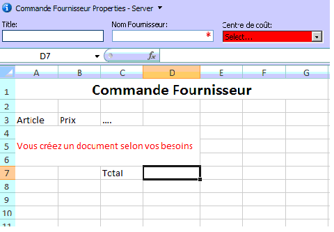 Avant d'associer le modèle de document, il faut le créer. Créez un document excel ou utilisez un document existant pouvant servir à l'encodage d'une commande fournisseur. Voici pour exemple, une capture d'écran du document que j'ai créé.
